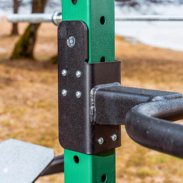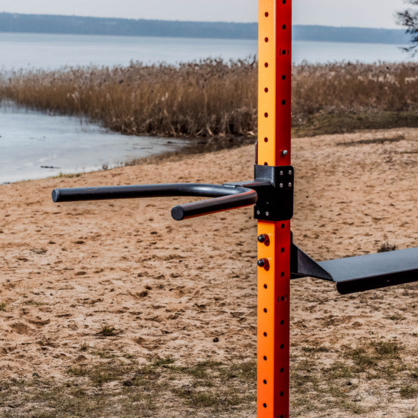 OXR-80 systemet kan naturligvis også benyttes indenfor og dip baren monteres nemt ved blot at løfte det op og sætte det ind med pinden i hullet og herefter låser det selv fast til stolpen.