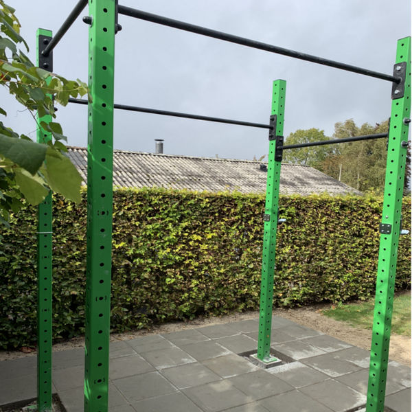 Kraftigt stativ med 122 cm bredde, så man kan lave squat med vægtstang samt 2 meters dybde for pullups og muligheden for at sætte monkey bars til armgang.